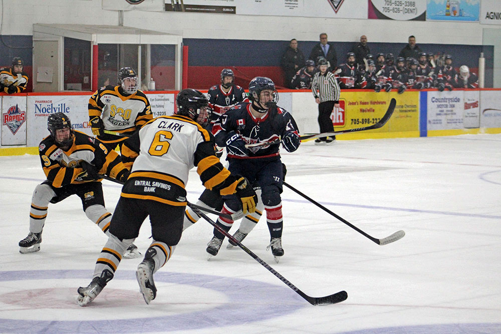 Visiting Sault Ste. Marie capitalized on a two-man advantage midway through the first period to take the lead when Logan Stawizynski stuffed in a Micah Seery cross-ice feed off some crisp puck movement in beating French River netminder Keiran Caughran.