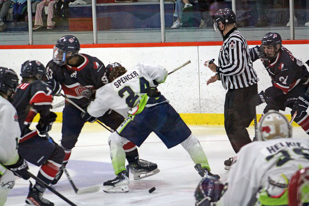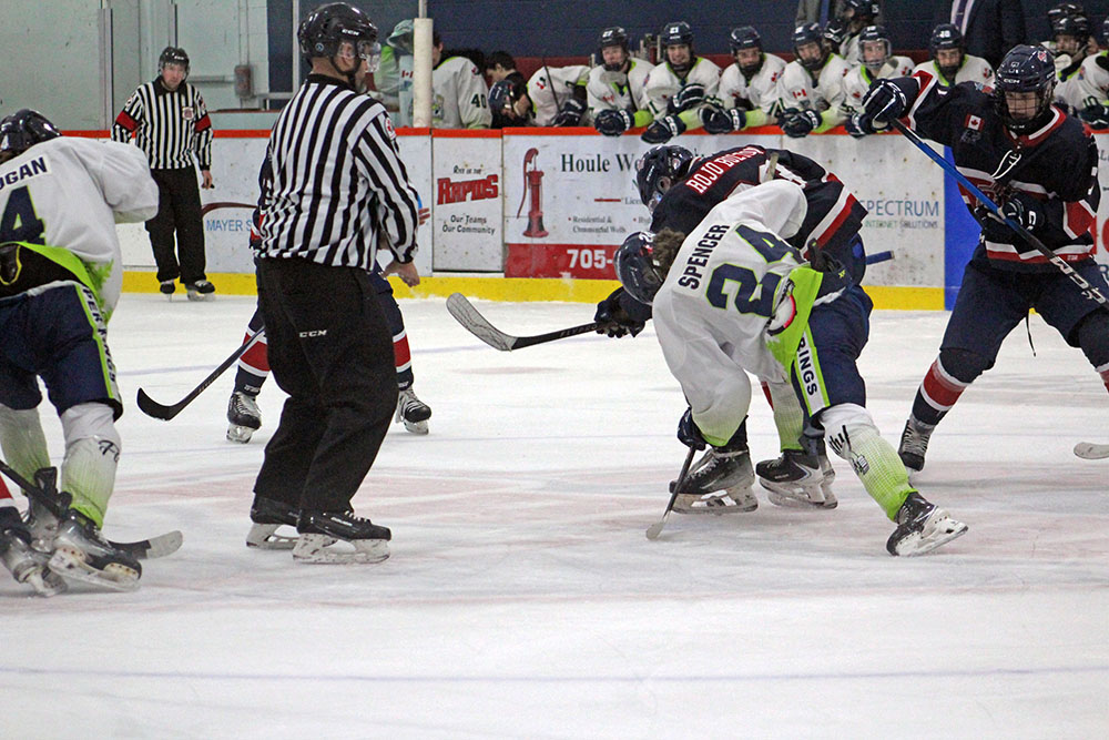Wasting little time, Espanola scored on the first shot of the game as Matthew Spencer blasted in his initial NOJHL tally with a drive from the slot that eluded French River starter Matis Bureau-Morel after being set-up from below the goal line by Noah Logan, just 25 seconds into the match-up.