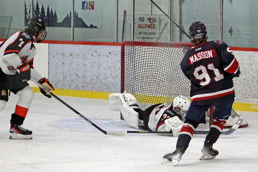 A giveaway off an attempted play around the boards left Hearst’s Aiden Kalin a wide-open net to deposit his 12th tally of the campaign, to give the visitors the lead at 9:15 of the first period.