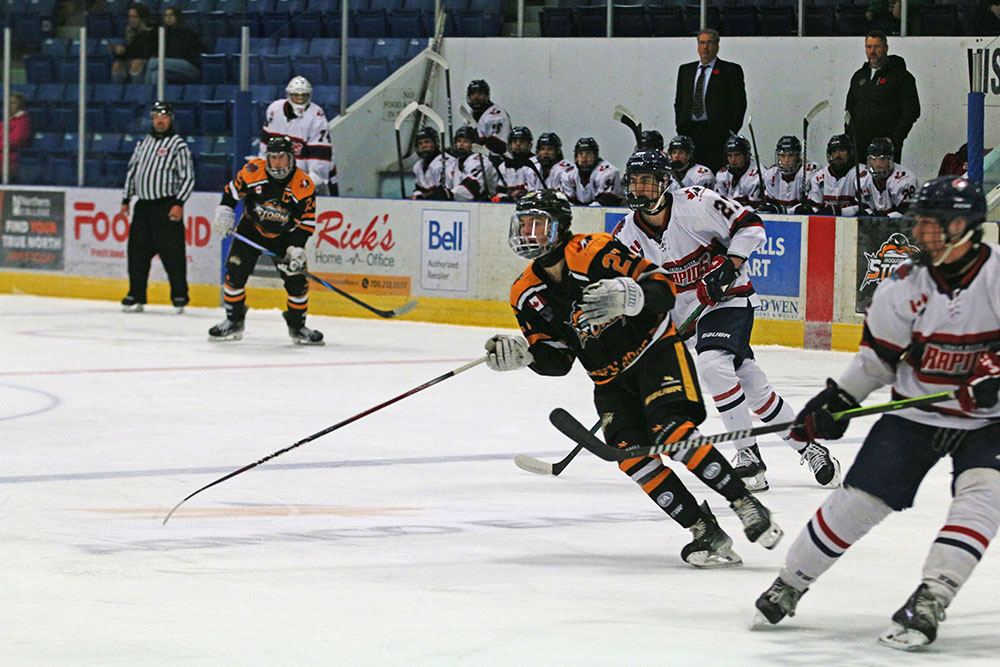 Breaking the deadlock six minutes into the second session, Iroquois Falls broke into the French River zone with speed and saw Max Jugnauth put a play in front that was lifted in high by Jaden Lyons over top of Rapids’ netminder Carter Vicente.
