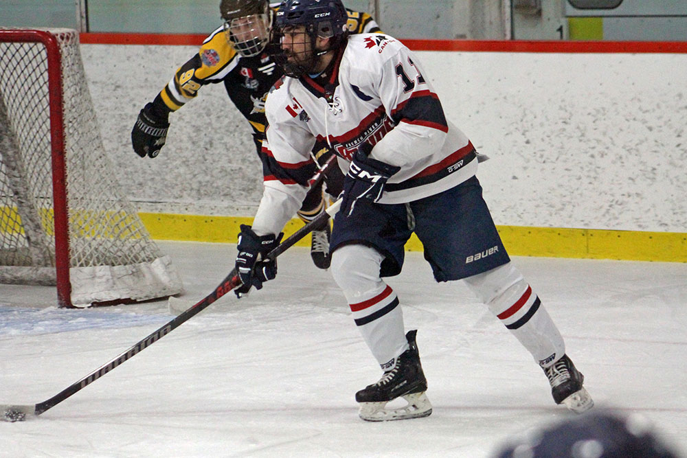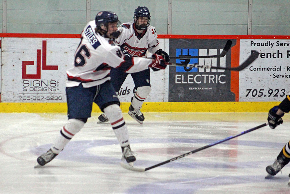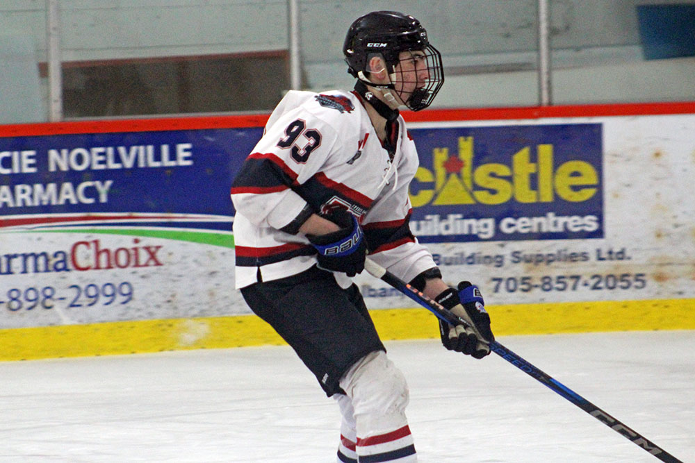 Answering back with an equalizer on the power play at 11:16, French River’s Ralph Coulis quickly snapped in a rebound off a Nolan McVeigh attempt from the left point past Iroquois Falls netminder Nathan Boudreau.